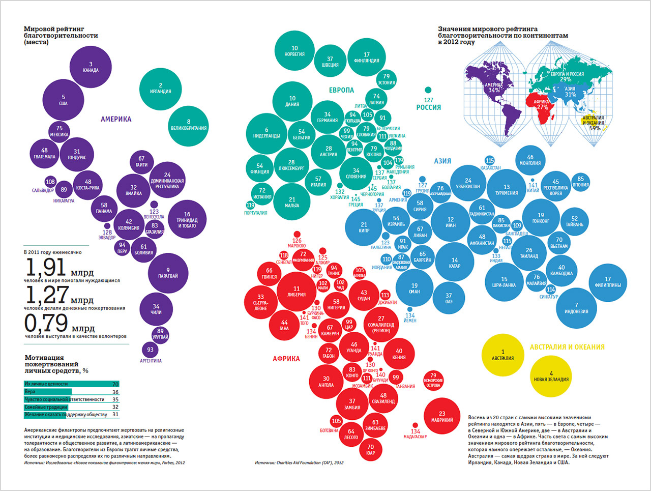 Статистика британского благотворительного фонда Charities Aid Foundation (CAF) свидетельствует, что за последние пять лет уровень вовлеченности мирового сообщества в благотворительную деятельность снизился. Чтобы вычислить среднее значение вовлеченности страны (а в рейтинге представлены данные по 146 странам) в благотворительную деятельность эксперты CAF суммировали три ключевых показателя: какая доля населения делает ежемесячные пожертвования в фонды, какая выступает в качестве волонтеров и какая оказывает непосредственную помощь нуждающимся.