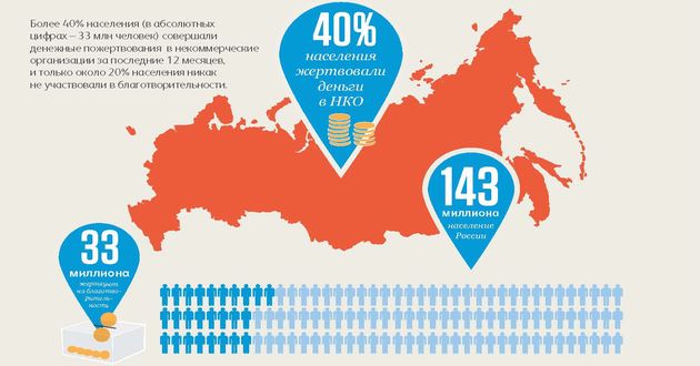 Результаты исследования показали гораздо более высокую, чем принято считать, вовлеченность россиян в благотворительность. Более 40% населения (в абсолютных цифрах – 33 млн человек) совершали денежные пожертвования за последние 12 месяцев в некоммерческие организации, и только около 20% населения не участвуют благотворительности ни в какой форме. Тем не менее, эти цифры меньше, чем в странах с развитой культурой благотворительности, например Великобританией, где 57 % делают денежные пожертвования; США (66 %) .