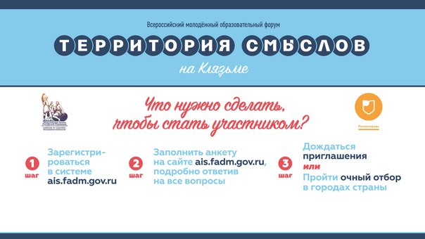 Для участия необходимо пройти регистрацию в автоматизированной информационной системе «Молодежь России» (http://ais.fadm.gov.ru), выбрав в графе мероприятий «Всероссийский молодежный образовательный форум «Территория смыслов на Клязьме».