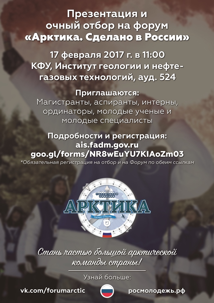 17 февраля 2017 года в 11:00 в КФУ, Институте геологии и нефтегазовых технологий в актовом зале (ул. Кремлевская, 4/5, ауд. 524) состоится презентация Международного молодежного образовательного форума «Арктика. Сделано в России», а также в ауд. 201 и 204 пройдет очный отбор для участия в Форуме.
